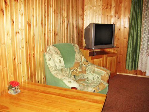 В номере: двуспальная кровать, кресло, журнальный столик, шкаф для одежды, телевизор, холодильник, чайник.